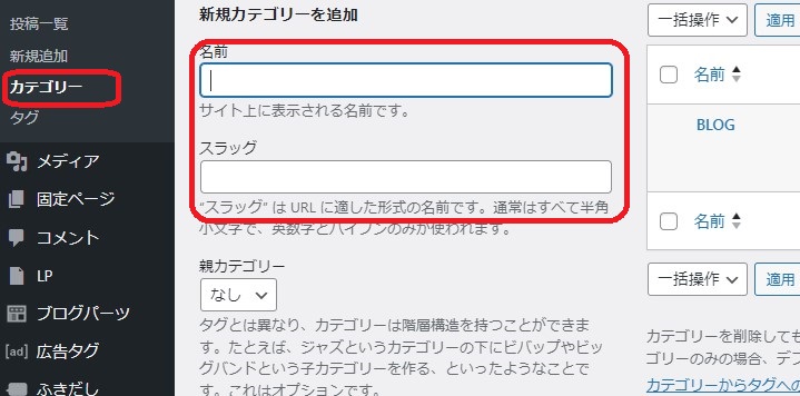 (スラッグはカテゴリーに分類した一覧ページのURLのこと。パーマリンク同様半角英数字がよき)