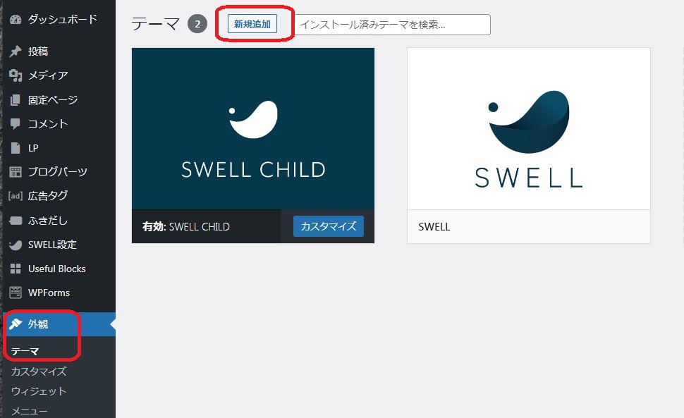 メニュー>外観>テーマ>新規追加 からアップロードして追加